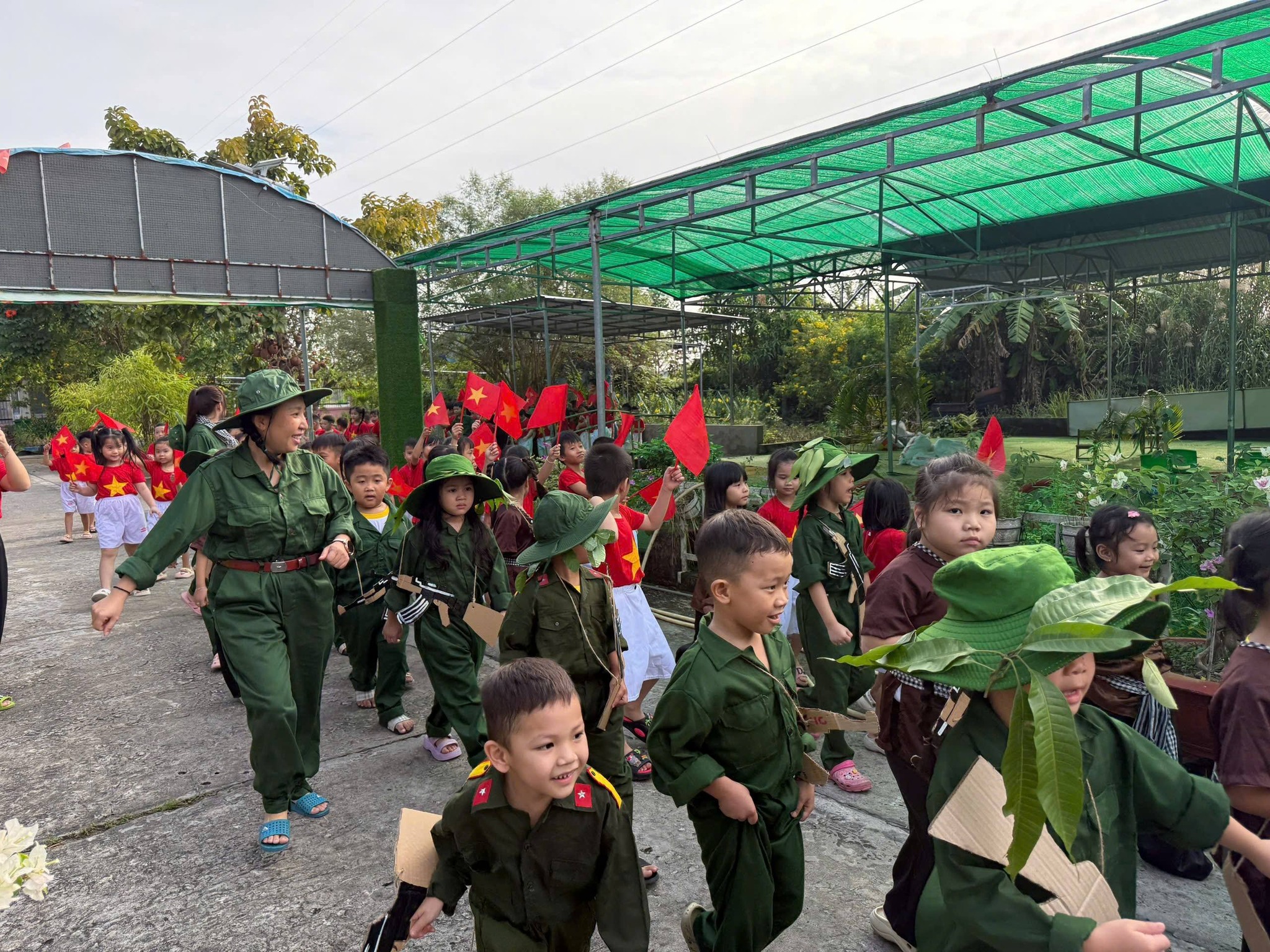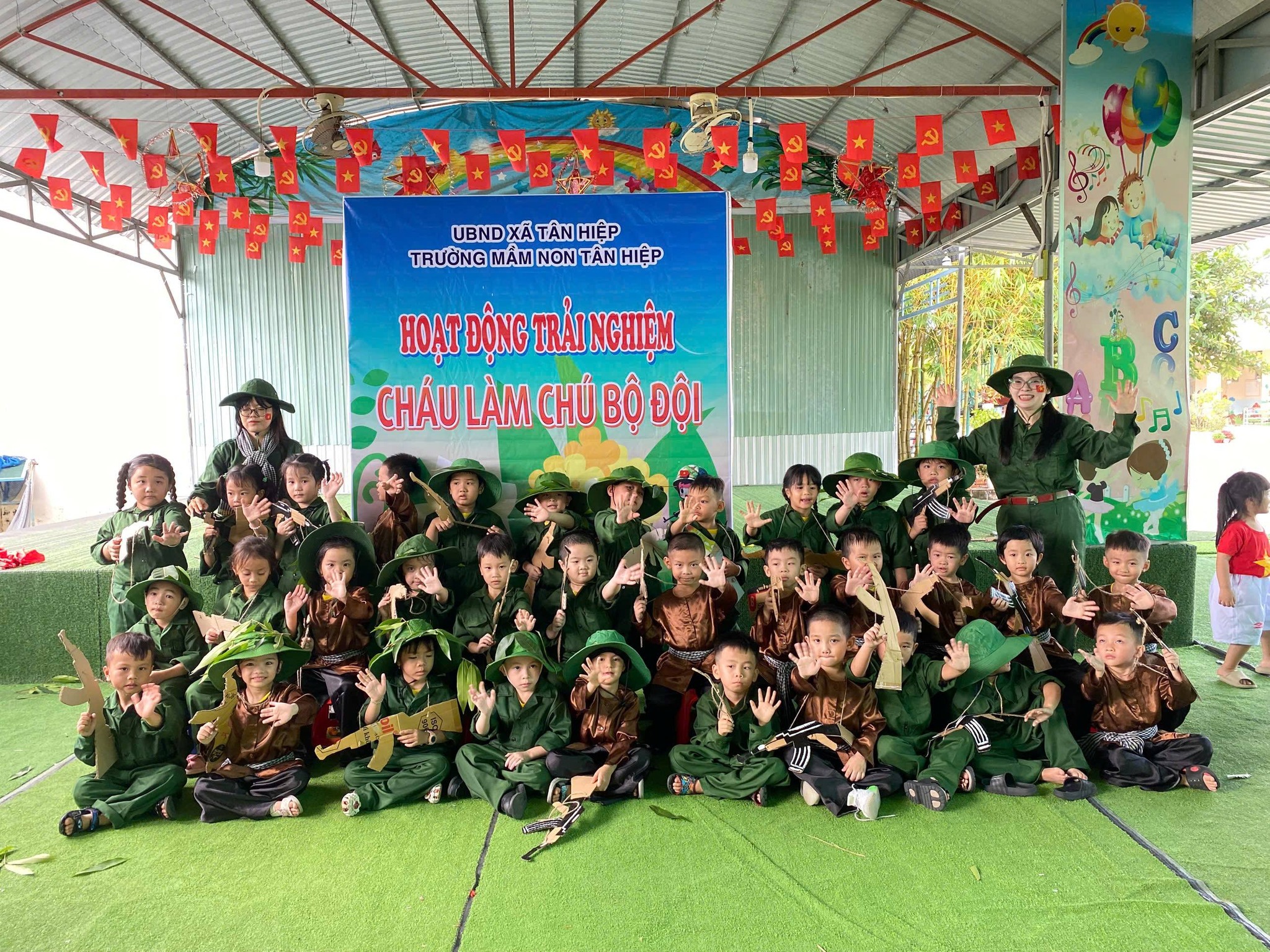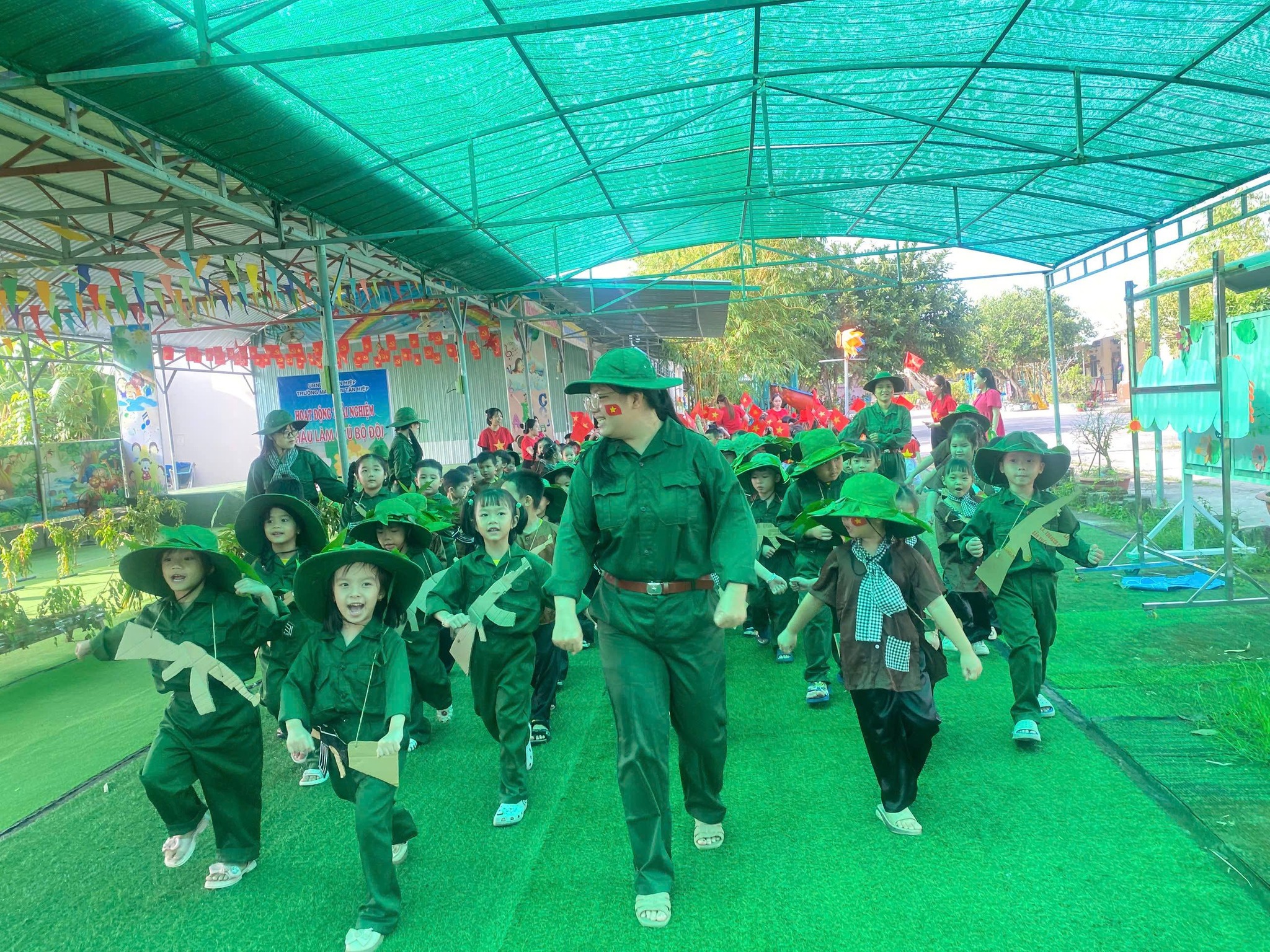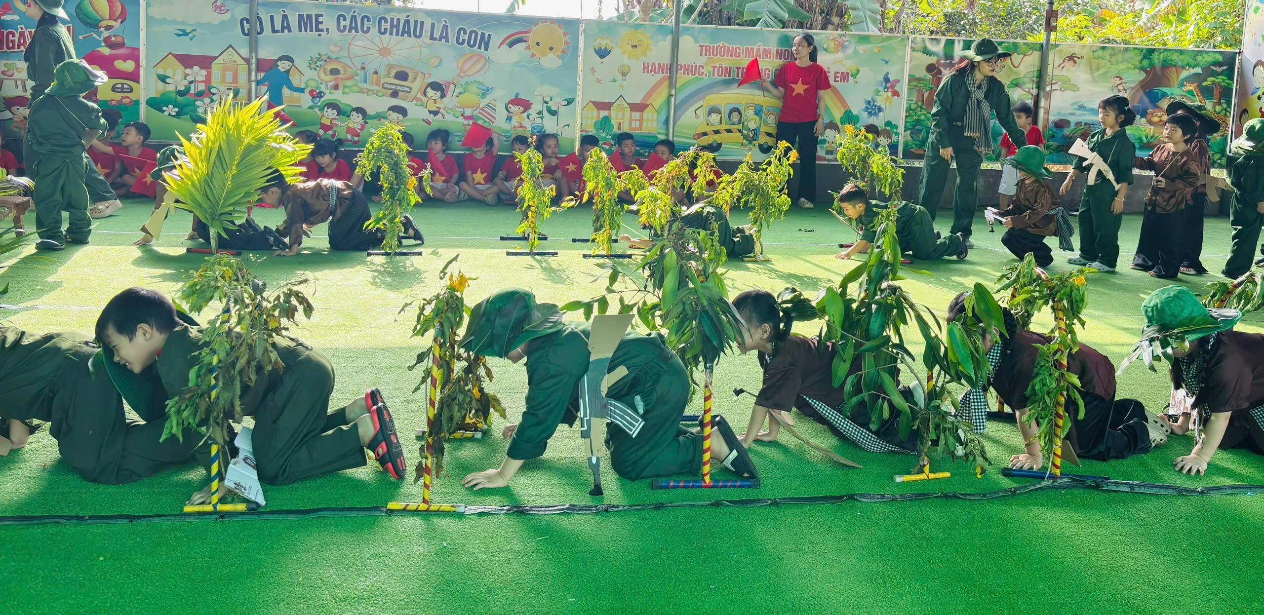 Nhân kỷ niệm Ngày thành lập Quân đội Nhân dân Việt Nam 22/12, nhà trường tổ chức hoạt động trải nghiệm “Cháu làm chú bộ đội” nhằm giúp trẻ hiểu biết những nét cơ bản về hình ảnh người chiến sĩ Quân đội Nhân dân Việt Nam – lực lượng anh hùng, trung thành với Tổ quốc, tận tụy vì Nhân dân. Thông qua hoạt động trải nghiệm ý nghĩa, các bé được hóa thân thành những chú bộ đội nhỏ, học cách rèn luyện tính kỷ luật, tinh thần đoàn kết, lòng yêu nước và niềm tự hào dân tộc. Đây là dịp giáo dục trẻ truyền thống “Uống nước nhớ nguồn”, góp phần bồi dưỡng nhân cách và tình yêu quê hương đất nước ngay từ những năm đầu đời.