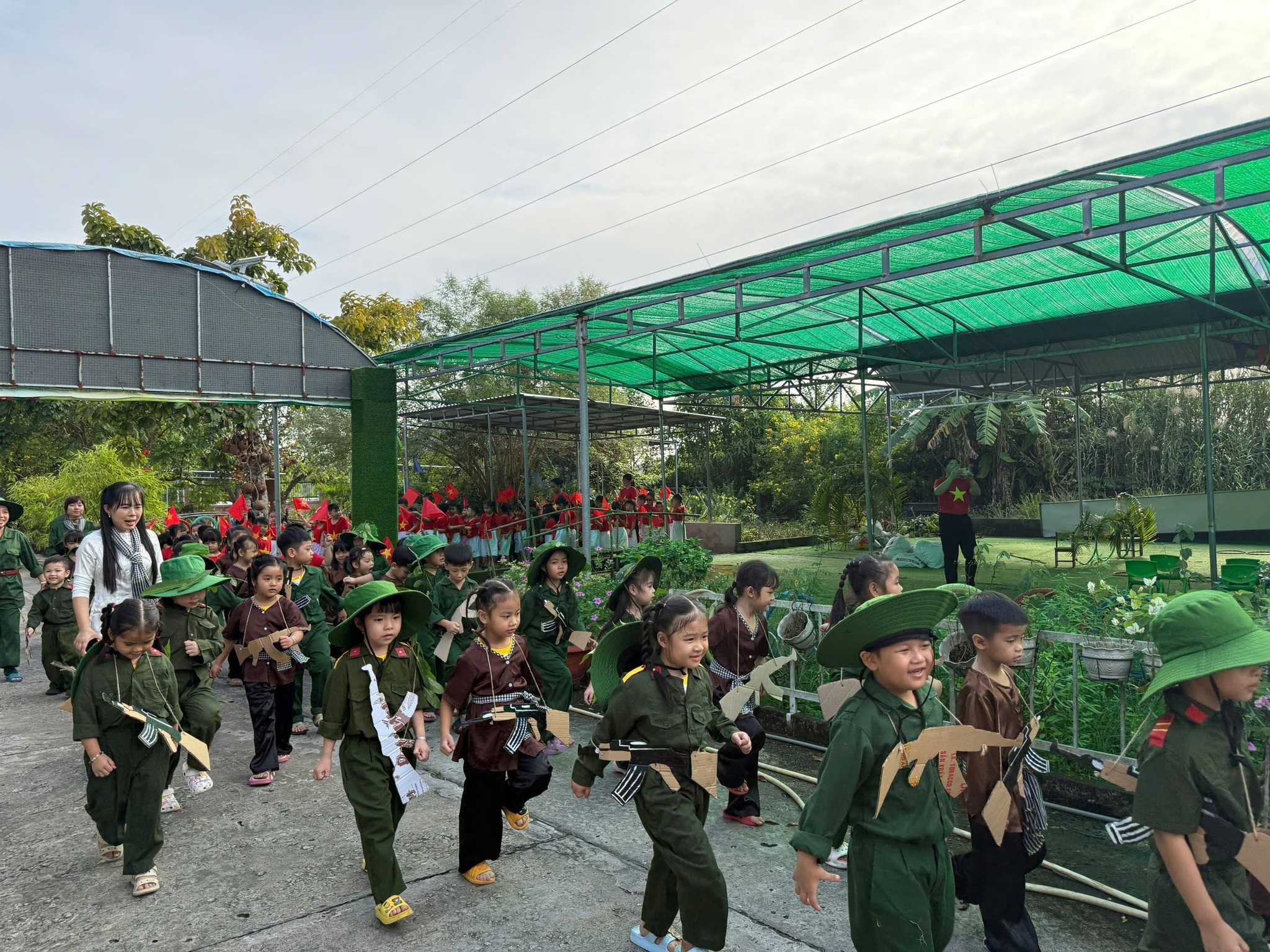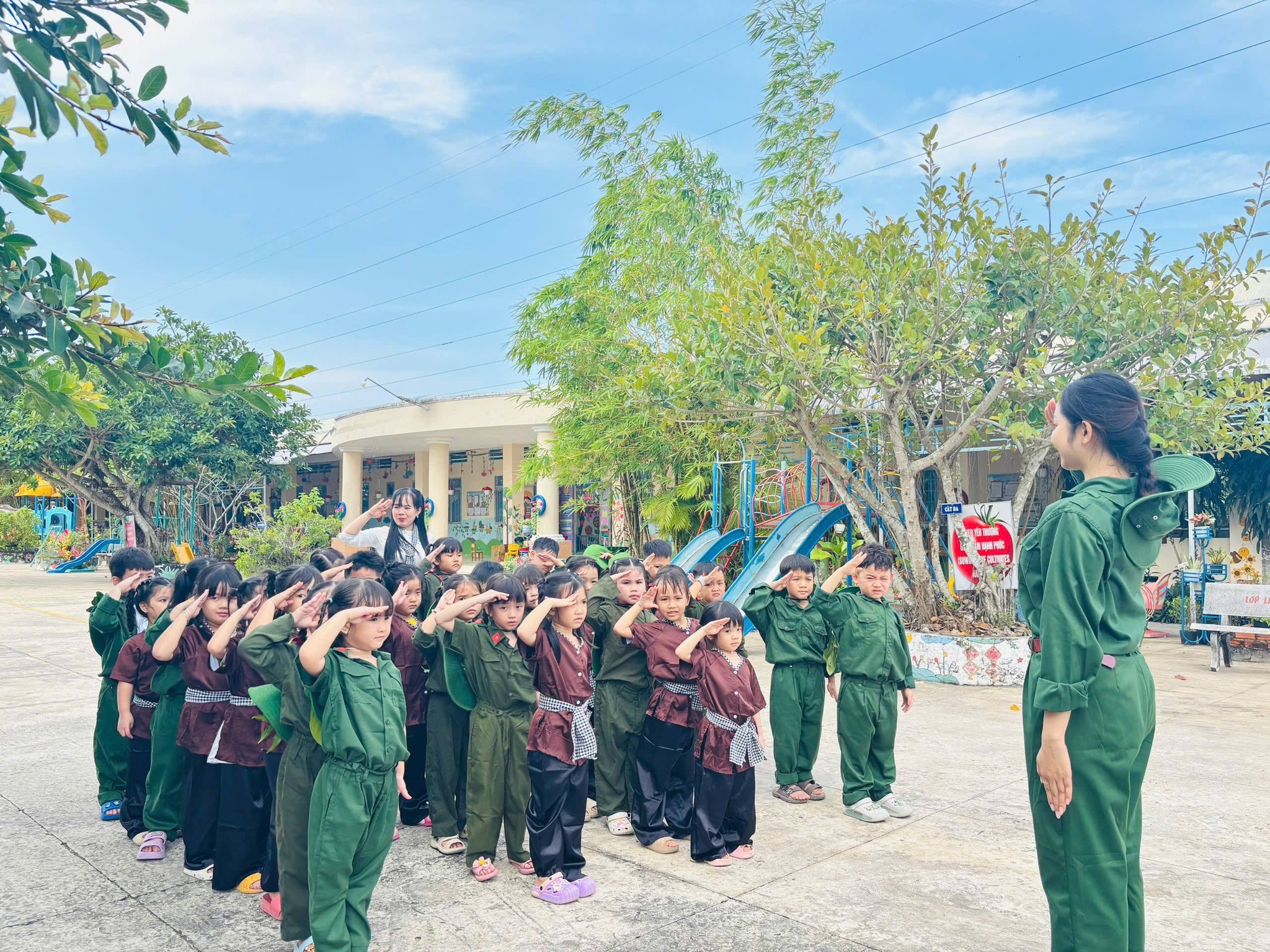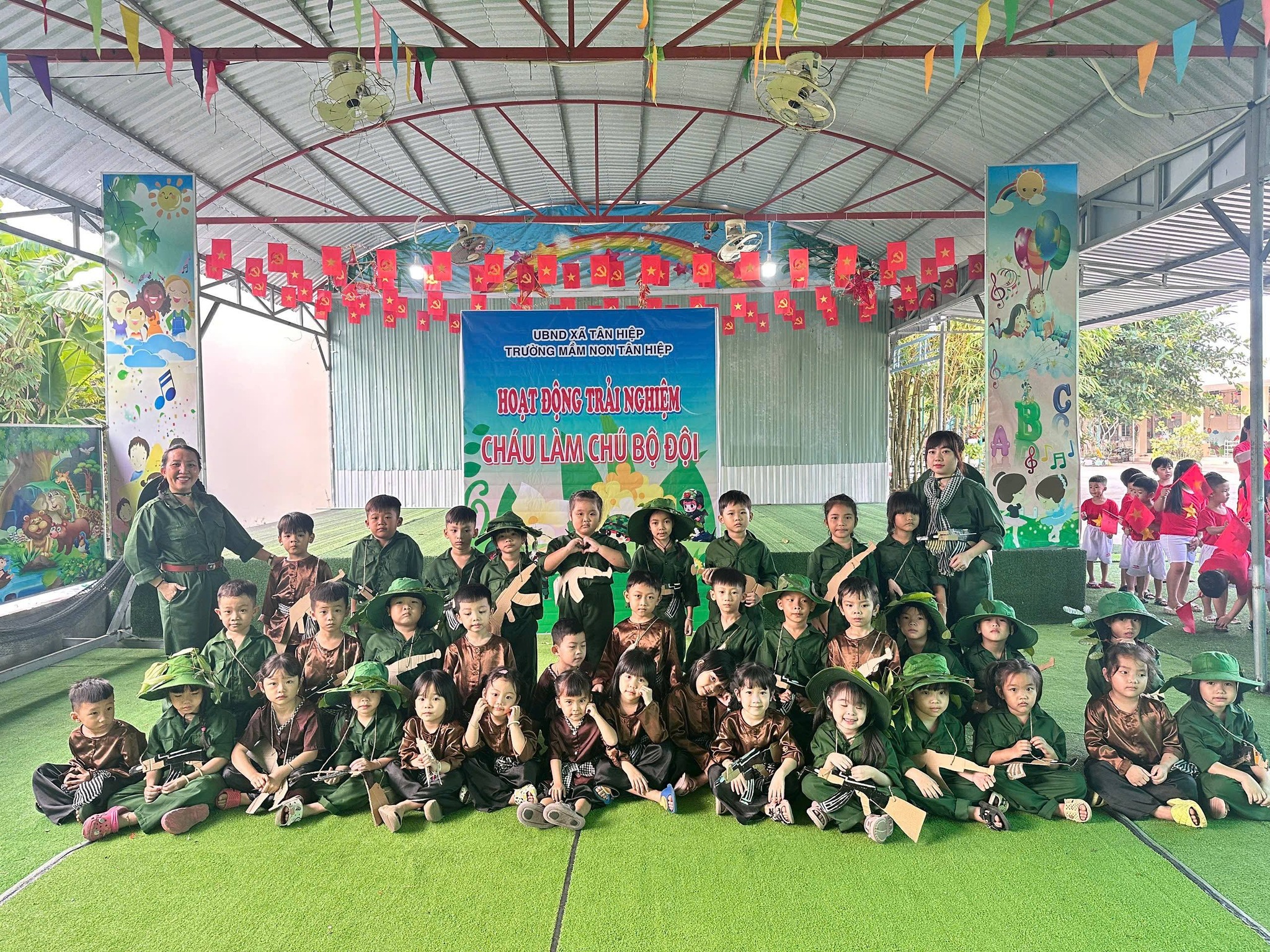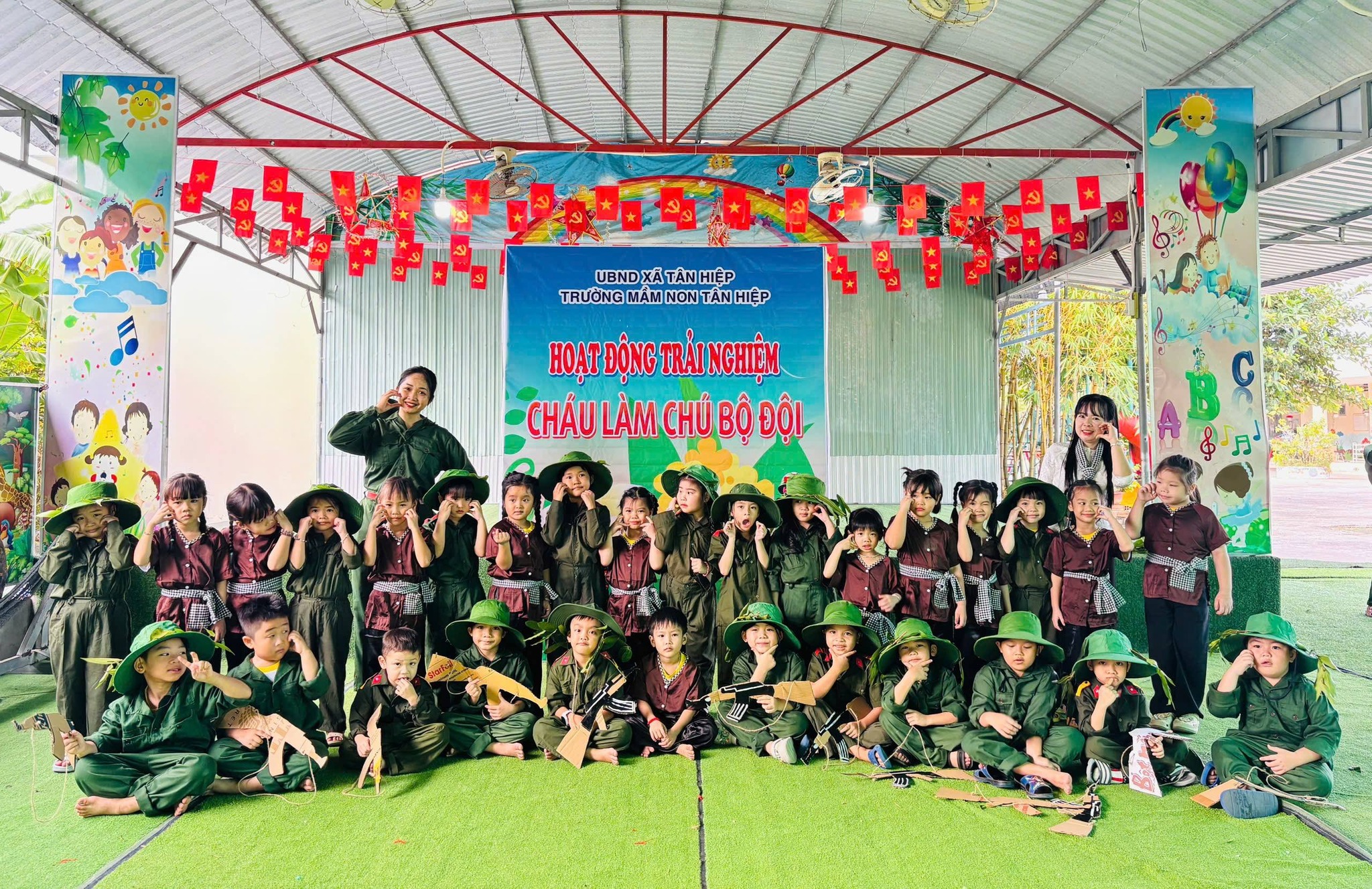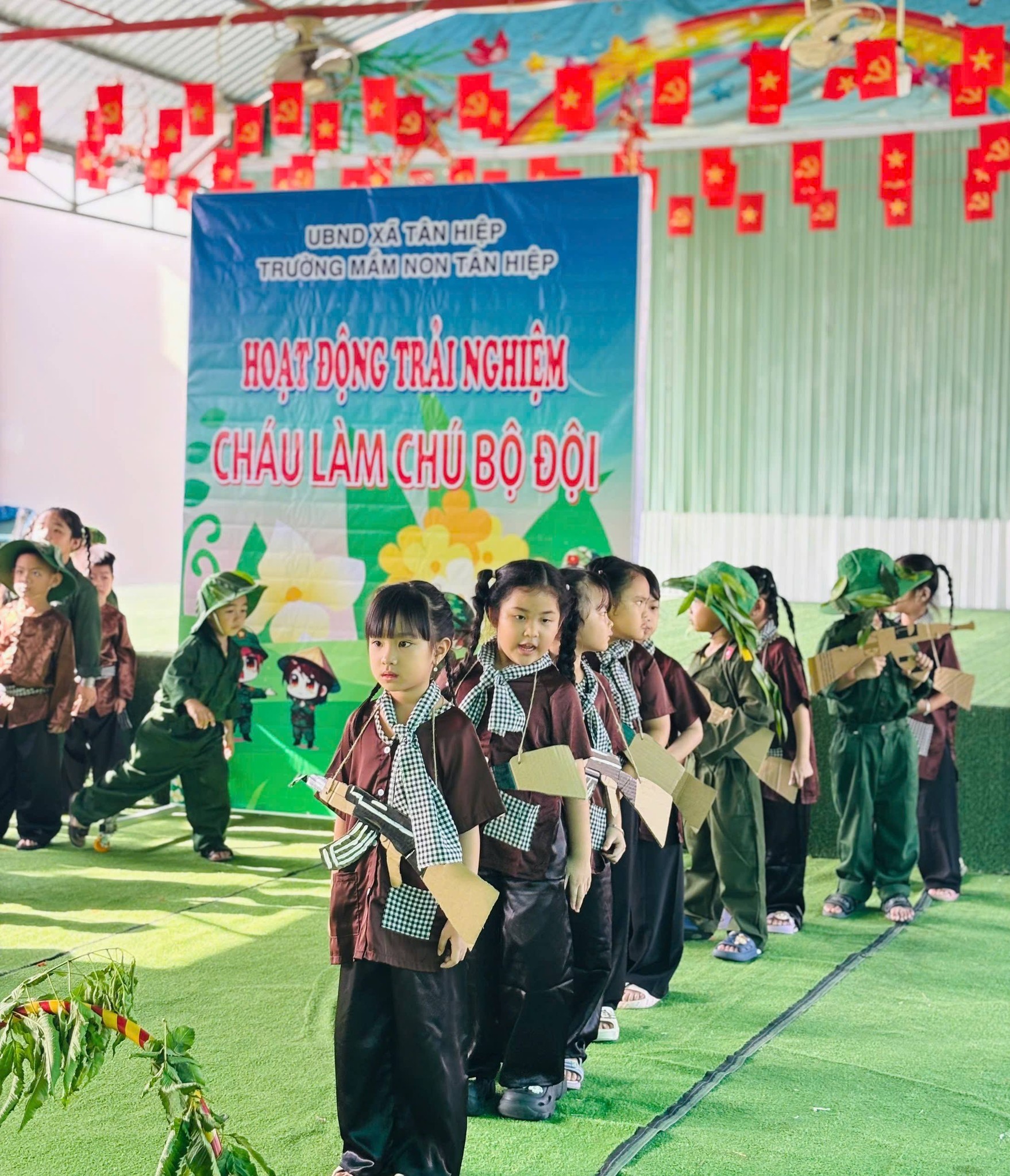 Nhân kỷ niệm Ngày thành lập Quân đội Nhân dân Việt Nam 22/12, nhà trường tổ chức hoạt động trải nghiệm “Cháu làm chú bộ đội” nhằm giúp trẻ hiểu biết những nét cơ bản về hình ảnh người chiến sĩ Quân đội Nhân dân Việt Nam – lực lượng anh hùng, trung thành với Tổ quốc, tận tụy vì Nhân dân. Thông qua hoạt động trải nghiệm ý nghĩa, các bé được hóa thân thành những chú bộ đội nhỏ, học cách rèn luyện tính kỷ luật, tinh thần đoàn kết, lòng yêu nước và niềm tự hào dân tộc. Đây là dịp giáo dục trẻ truyền thống “Uống nước nhớ nguồn”, góp phần bồi dưỡng nhân cách và tình yêu quê hương đất nước ngay từ những năm đầu đời.